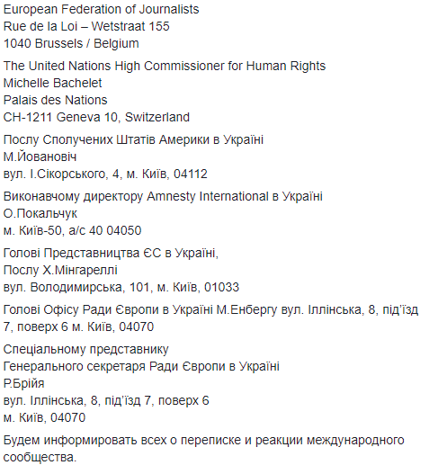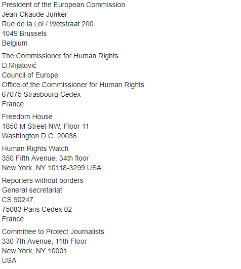 В списке значатся порядка 17 организаций, которые получат обращение о вмешательстве в журналистскую деятельность. Среди них президент Европейского Совета Дональд Туск, депатат ПАСЕ от Швейцарии Лилиан Маури Паскер, генсекретарь Совета Европы Турбьёрн Ягланд, Верховный представитель Европейского союза по иностранным делам и политике безопасности в Комиссии Юнкера Федерика Могерини, а также Репортеры без границ, комитет по защите прав журналистов и прочие инстанции.