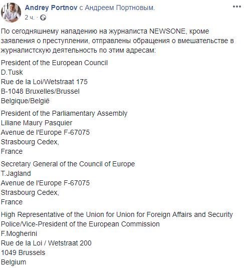 Известный юрист, правозащитник и новый управляющий канала NewsOne Андрей Портнов обратился с заявлением в международные организации после атаки на журналиста телеканала Дарину Билеру во время сегодняшнего штурма Генпрокуратуры националистами.