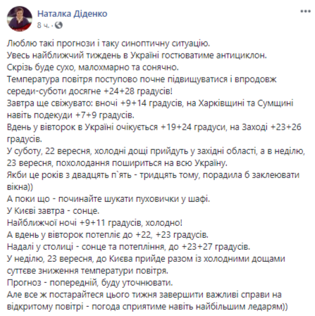 "Люблю такие прогнозы и такую синоптическую ситуацию. Всю ближайшую неделю в Украине будет гостить антициклон. Везде будет сухо, ясно и солнечно", - написала она.