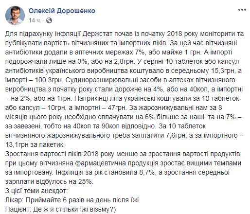"В августе 10 таблеток или капсул антибиотиков украинского производства стоили в среднем 15,3 грн, а в импорте - 100,3 грн. Сосудорасширяющие средства в аптеках отечественного производства с начала года стали дороже на 4%, или на 40 коп., а импортные - на 2%, или на 1 грн. В конце лета украинские стоили по 10 таблеток или капсул - 10 грн, а импортные - 47 грн", - сообщил Дорошенко.