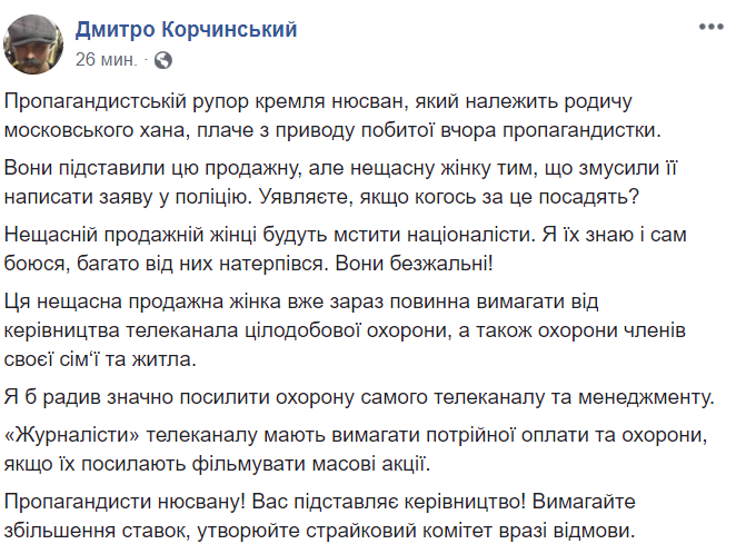 Лидер "Братства" Дмитрий Корчинский опубликовал в Facebook пост с угрозами журналистке NewsOne Дарье Билере, которую вчера националисты закидали яйцами и избили