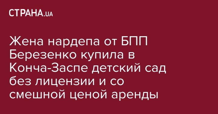 Жена нардепа от БПП Сергея Березенко Ульяна купила детский сад "Кидсвуд" на закрытой территории "Дома отдыха "Конча-Заспа" Государственного управления делами, которое после Революции Достоинства возглавлял Сергей Березенко. Об этом сообщает программа "Наші гроші з Денисом Бігусом".