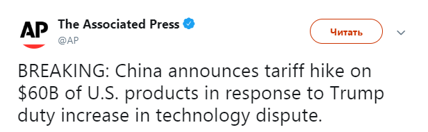 Ранее в августе обострение торгового спора США и Китая вылилось импортные пошлины на $16 миллиардов.