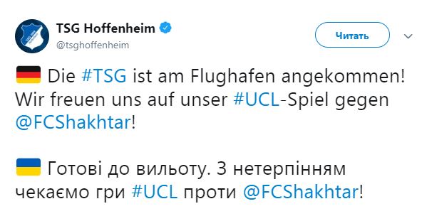 Официальный Twitter немецкого клуба Хоффенхайм накануне матча 1-го тура группового этапа Лиги Чемпионов с Шахтером свои сообщения начал дублировать на украинском языке. Так, перед вылетом в Украину сегодня, 18 сентября, появилось сообщение: "Готовы к вылету. С нетерпением ждем игры против Шахтера!".