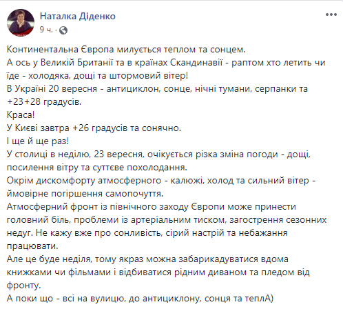 "В столице в воскресенье, 23 сентября, ожидается резкое изменение погоды – дожди, усиление ветра и существенное похолодание", – написала Диденко.