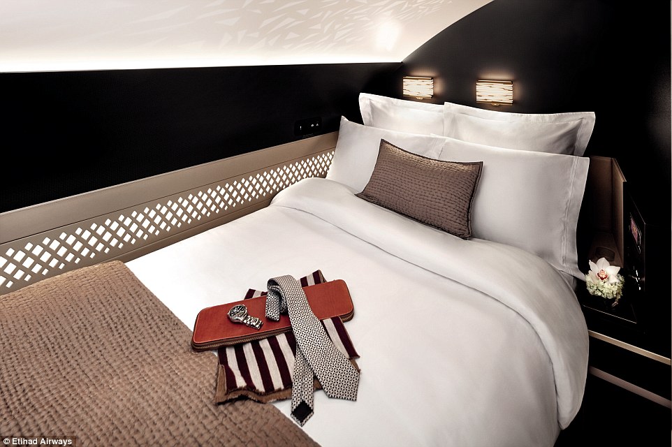Шикарный номер на борту авиалайнера включает в себя гостиную, спальню и ванную комнату. В распоряжении пассажира предоставляется большая двухместная кровать, а также два огромных телевизора.