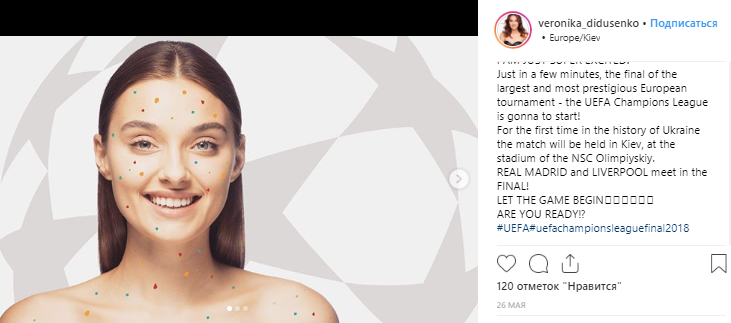 Судя по записям в соцсети, девушка также неравнодушна к футболу. По крайней мере, она напоминала о финале Лиги чемпионов, который в этом году состоялся в Киеве. И спрашивала подписчиков, за кого они болеют - Ливерпуль или Реал.