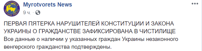 "Первая пятерка нарушителей Конституции и закона Украины о гражданстве зафиксирована в Чистилище. Все данные о наличии у указанных граждан Украины незаконного венгерского гражданства подтверждены", - сказано в сообщении.