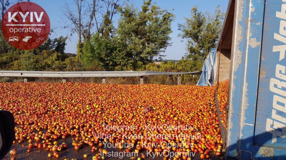 Тонны яблок усыпали дорогу. Под Киевом перевернулся грузовик с фруктами. Фото последствий