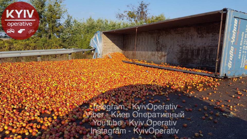 Сообщается, что что на дороге перевернулся грузовик, который перевозил тонны яблок. Авария произошла на 120-м км трассы.