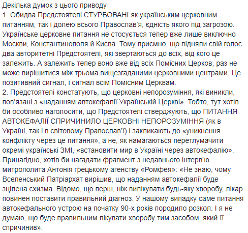 По мнению протоиерея, предстоятели констатируют, что возникшие церковные недоразумения связаны именно с "предоставлением автокефалии украинской церкви".