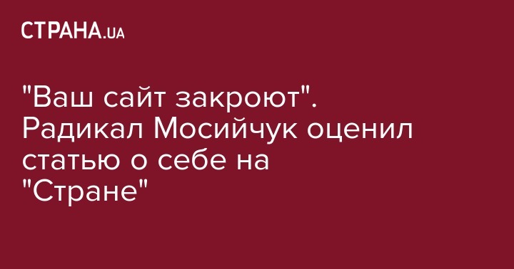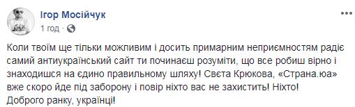 "Когда твоим пока что только возможным и довольно призрачным неприятностям радуется самый антиукраинский сайт, ты начинаешь понимать, что все делаешь верно и находишься на единственно верно пути! Света Крюкова (Светлана Крюкова – замглавреда "Страны" – Прим.Ред.) "Страна.юа" уже скоро попадет под запрет и поверь, никто вас не защитит! Никто!" – написал Мосийчук, сопроводив пост  скриншотом главный страницы сайта.