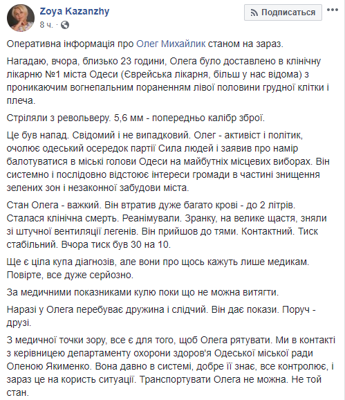 "Вчера, около 23 часов, Олег был доставлен в клиническую больницу №1 города Одессы (Еврейская больница, более у нас известная) с проникающим огнестрельным ранением левой половины грудной клетки и плеча. Стреляли из револьвера. 5,6 мм - предварительно калибр оружия. Это было нападение. Осознанное и не случайное", - написала она.