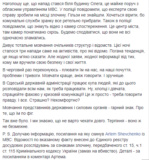 "Подчеркну еще, что нападение произошло возле дома Олега, это почти рядом с областным управлением МВД. В полиции сообщили, что эксперты свое дело сделали на месте преступления. Гильзы не нашли. Хочется верить, потому что коммунальные службы утром все тщательно убрали. Также в полиции сообщили, что снимут видео с камер наблюдения. Это центр города, там камер понатыкано везде. Будем надеяться, что они не все одновременно сломались", - добавила Казанжи.