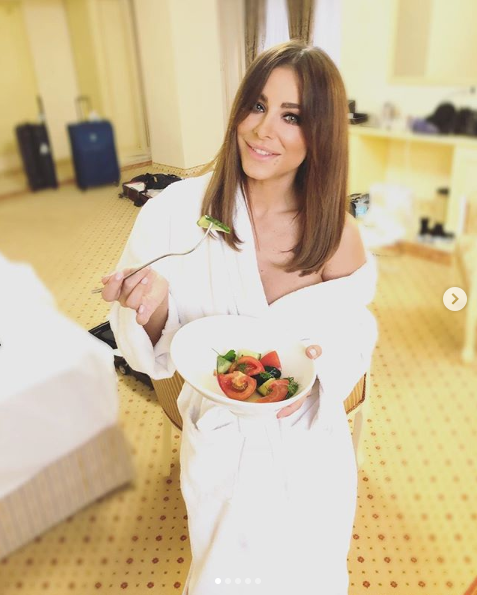 На снимке певица красуется в халате с оголенным плечом. В руках у нее тарелка с салатом.