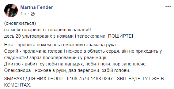 На вопрос, представители которой именно ультраправой организации напали на них во Львове, Яблонская ответила, что не могла узнать. Также она отметила, что парень, который получил ранения головы, пришел в себя.