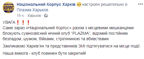 Вечером в воскресенье, 24 сентября, в Харькове члены "Нацкорпуса" ("Азов") заблокировали ночной клуб "Плазма" из-за того, что он якобы "мешал местным жителям". Его владелец "пообещал, что продаст здание". Об этом сообщается на странице Нацкорпуса в Facebook.