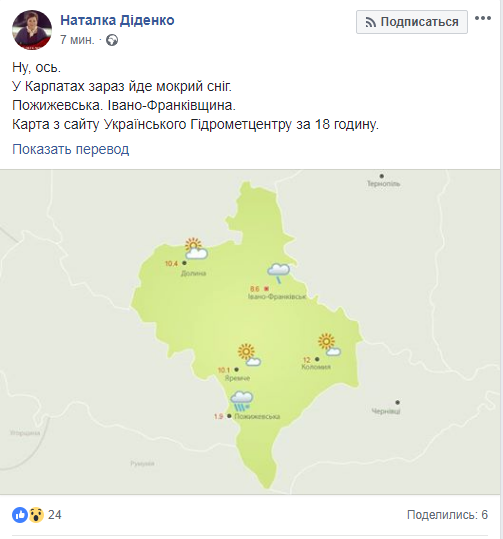 23 сентября в Украине похолодало. Заморозки синоптики прогнозировали и на всю текущую неделю. И вечером 24 сентября в Карпатах пошел мокрый снег. Об этом написала на своей странице в Facebook синоптик Наталья Диденко.