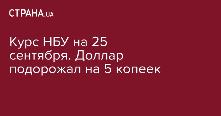 Во вторник, 25 сентября, Нацбанк Украины (НБУ) установил официальный курс доллара на уровне 28,11 грн/долл. По сравнению с предыдущим банковским днем, доллар подорожал на 5 копеек. Об этом сообщается на сайте регулятора.