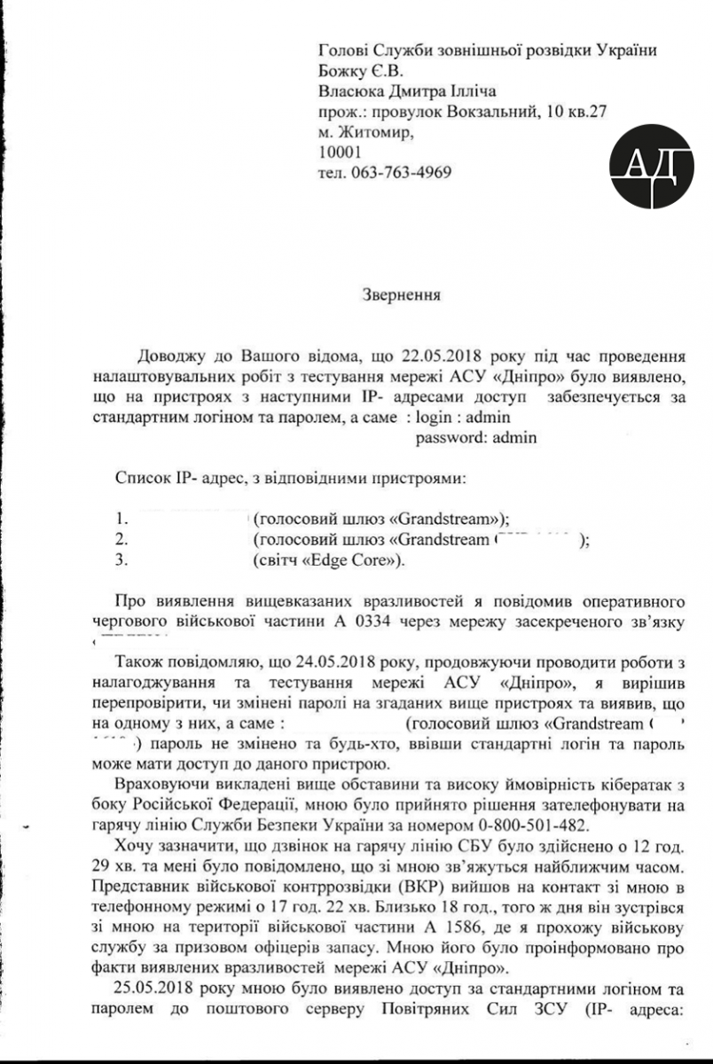 Ссылаясь на документы, которые оказались в его распоряжении, Дубинский пишет, что 22 мая 2018 года во время настройки и проведения тестирования сетей Автоматизированной системы управления войсками "Днiпро" специалист по базам данных Дмитрий Власюк выявил, что на многих серверах и коммутаторах с IP-адресами доступ происходит по стандартному логину и паролю. Дмитрий Власюк, согласно резюме, на данный момент проходит службу в воинской части А1586 по призыву, офицера запаса.