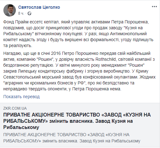 Отмечается, что покупатель отечественный, а для подписания соглашения необходимо согласие Антимонопольного комитета. Также Цеголко сообщил, что компанию "Рошен" в доверительную собственность Rothschild президент передал в 2016 году, а в апреле 2017, по информации пресс-секретаря Порошенко, Липецкая кондитерская фабрика свернула производство. По словам Святослава Цеголко, аграрных или крахмальных бизнесов в РФ у Петра Порошенко нет.
