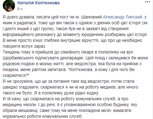 "Эти списки жителей пришли в неофициальном письме, но в устном приказном порядке, прислали из КГГА в Центр медицинской помощи Шевченковского района. Я не понимаю, почему руководство города с помощью ЖЭКов и информации с 1551 создало эти списки", - пишет Коптенкова.