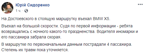 Сидоренко также сообщил, что иномарка двигалась с большой скоростью. "Судя по первой информации - ребята возвращались с ночного какого-то празднества", - написал Юрий Сидоренко.
