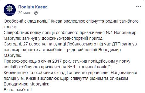 В полиции подтвердили, что Владимир Маргулис был пассажиром автомобиля. "Руководство и личный состав Главного управления Национальной полиции в Киеве выражают соболезнования родным и близким погибшего", - говорится в сообщении.