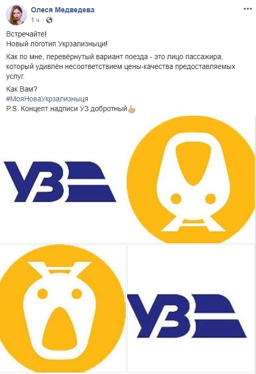 Блогер Юрий Коротких: "Новый логотип УЗ увековечил первые две буквы коронного обращения: "УВажаемые пассажиры" вместе со шлемом Хищника.