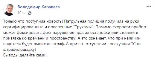 "Патрульная полиция получила на руки сертифицированные и поверенные "Трукамы". Кроме скорости, прибор может фиксировать факт нарушения правил остановки или стоянки в привязке ко времени и пространству! А это значит, что при наличии водителя будет выписан штраф. А при его отсутствии - эвакуация ТС на штрафплощадку!", - отметил он.