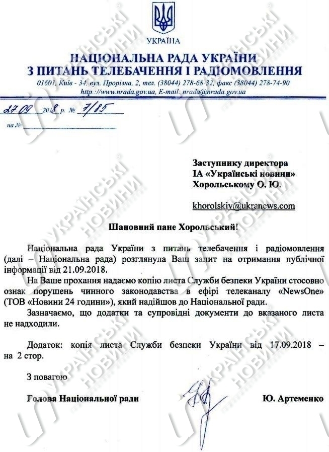 Об этом говорится в письме Департамента защиты национальной государственности СБУ , предоставленном Нацсоветом по телевидению и радиовещанию на запрос "Українських Новин".