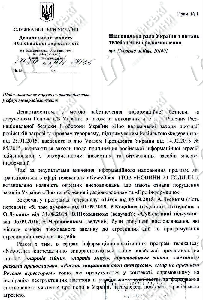 Также авторы письма утверждают, что слышали в эфире телеканала словосочетания "братоубийственная война", "механизм раскола православия" и "мир не признает Россию агрессором". При этом, где и когда звучали подобные высказывания в письме СБУ не указывается. А "приложения и сопроводительные документы" к письму от СБУ в Нацсовет не поступали.