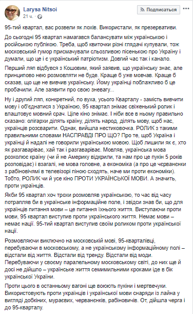 Далее Ницой и вовсе обвинила "Квартал 95" в том, что он выступает против украинской жизни и нации.