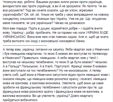 "До сих пор 95 Квартал пытался балансировать между украинской и российской публикой. Надо, чтобы билетики разные зрители покупали, поэтому московский юмор сдабривали слезливой песенкой об Украине и думали, что это и есть украинский патриотизм. Долгое время так и канало", - негодует писательница на своей странице в соцсети.