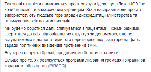 Минздрав Украины общается с родственниками пациентов, которым необходимо лечение за границей. Однако на эти встречи не приглашают активистов, которые живут в палатках у здания министерства. Об этом замминистра здравоохранения Ольги Стефанишина написала на своей странице в Facebook.