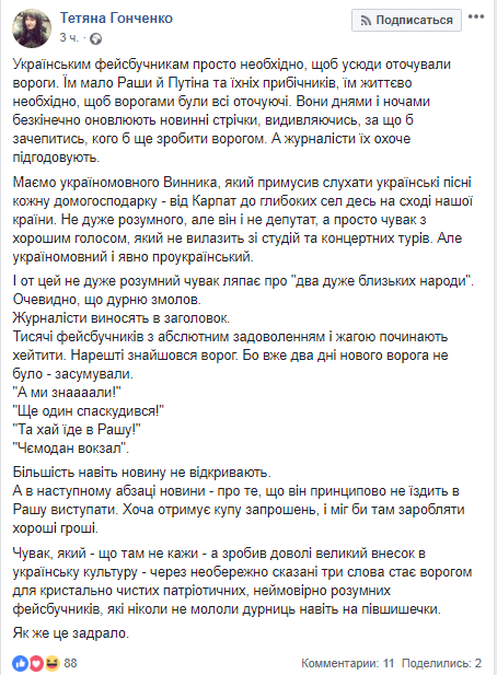 Нашлись у Винника и защитники. К примеру, Татьяна Гончаренко предлагает не предаваться общественному порицанию, а вспомнить о вкладе в культуру, который сделал Олег Винник. По ее мнению, именно он заставил "слушать украинские песни каждую домохозяйку - от Карпат до глубоких сел где-то на востоке нашей страны". Татьяна полагает, что Винник просто не очень умный и "смолол чушь".