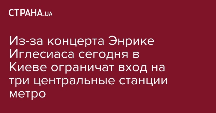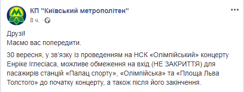 В субботу, 30 сентября, из-за концерта Энрике Иглесиаса в НСК "Олимпийский" в Киеве изменится работа метро. Об этом пресс-служба КП "Киевский метрополитен" сообщила на своей странице в Facebook.