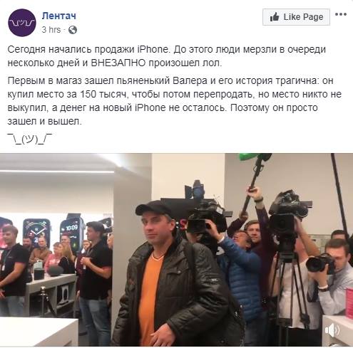 Кроме того, стала известна личность первого потенциального покупателя, который зашел в магазин 28 сентября. Им оказался владелец девятого талона Валерий. Как сообщается на странице сообщества "Лентач" в Facebook, первые восемь человек не смогли продать свои места, порвали талоны и ушли. Сам Валерий купил свое место в очереди за 150 тысяч рублей. Телефон он покупать не собирался - хотел перепродать талон и заработать, однако желающих не нашел. Его пригласили в магазин, он зашел, но денег на iPhone у него не осталось. Поэтому он пообщался с продавцами и журналистами и вышел.