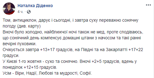 "Ночью было холодно, ближайшей ночью также не сахар, но надеюсь, что солнечный день компенсирует домашние штаны с начесом и такие ранние вечерние пуховики. Ожидается завтра +13...+17 градусов, на юге и на Закарпатье +17...+22 градуса.