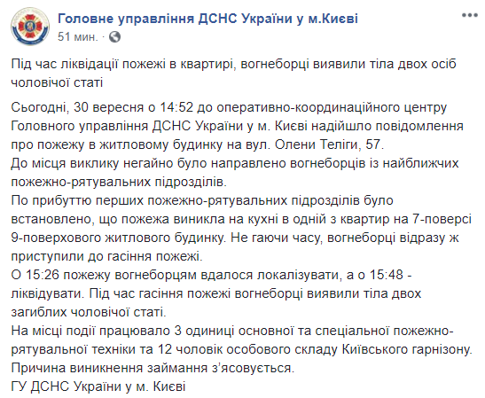 "Сегодня, 30 сентября в 14:52 в оперативно-координационный центр Главного управления ГСЧС Украины в г. Киеве поступило сообщение о пожаре в жилом доме на вул. Елены Телиги, 57", - говорится в сообщении.