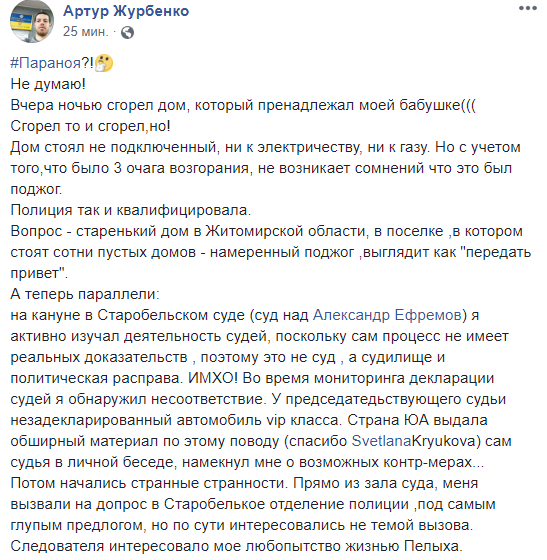 Представитель организации "Правовой контроль Украины" Артур Журбенко, который является автором материала "Страны" об имуществе судьи по делу Александра Ефремова Александра Пелиха, сообщил о том, что неизвестные сожгли его дом в Житомирской области. Об этом он сообщил на странице в Facebook.