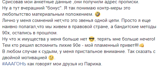 Не смотря на поджог его имущества, он и в дальнейшем собирается писать расследования о жизни судей.