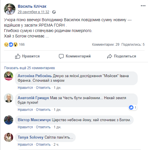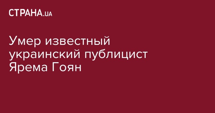 28 сентября в Украине умер известный публицист, журналист, руководитель детского издательства Ярема Гоян. Об этом на своей странице в Facebook сообщил директор издательского центра "Просвита" Василий Кличак.