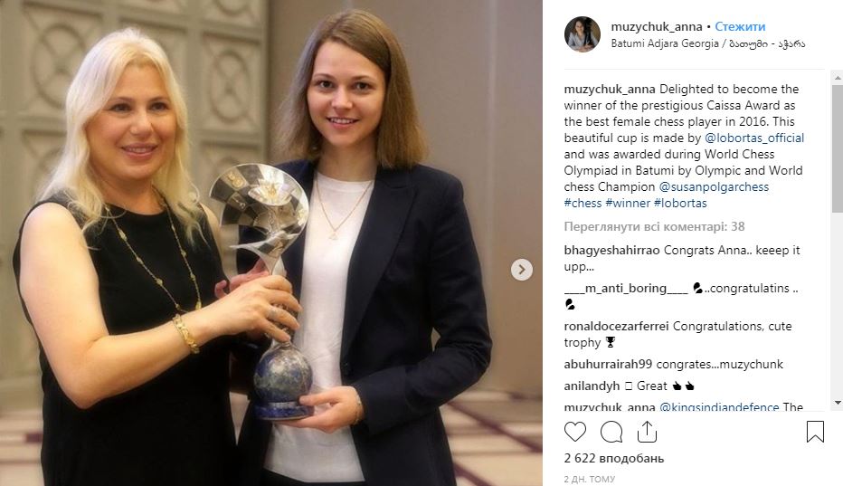 "Рада стать победителем престижной "Caissa Award" как лучшей женщине-шахматистке за 2016", — говорится в записи львовянки. Приз ей вручили во время всемирной шахматной Олимпиады в Батуми.
