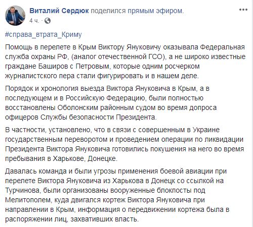 "В частности, установлено, что в связи с совершенным в Украине государственным переворотом и проведением операции по ликвидации президента Виктора Януковича готовились покушения на него во время пребывания в Харькове, Донецке. Давалась команда и были угрозы применения боевой авиации при перелете Виктора Януковича из Харькова в Донецк со ссылкой на Турчинова, были организованы вооруженные блокпосты под Мелитополем, куда двигался кортеж Виктора Януковича при направлении в Крым, информация о передвижении кортежа была в распоряжении лиц, захвативших власть", - рассказывает Сердюк.