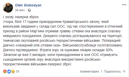 По словам Олега Слободяна, это уже 5 случай, когда украинские пограничники с зоне ООС получают повреждения органов зрения из-за использования врагом лазерного оружия.