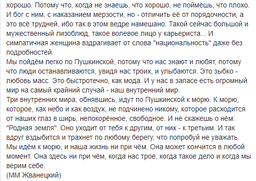 Три внутренних мира, обнявшись, идут по Пушкинской к морю. К морю, которое, как небо и как воздух, не подчинено никому, которое расходится от наших глаз в ширь, непокорённое, свободное. И не скажешь о нём: "Родная земля". Оно уходит от тебя к другим, от них – к третьим. И так вдруг вздыбится и трахнет по любому берегу, что попробуй не уважать.