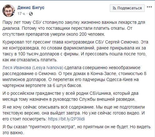 "Пару лет тому СБУ стопануло закупку жизненно важных лекарств для диализа. Потому что поставщики перестали платить откаты. От отсутствия препаратов умерли около 200 человек. Курировал тот прессинг глава контрразведки СБУ Сергей Семочко. Эта же контрразведка, по словам фармкомпаний, ранее прикрывала их за таксу в 100 тысяч долларов с фирмы. И прессовать пошла после того, как им отказались платить.", - также сообщил Денис Бигус на своей странице в Facebook.