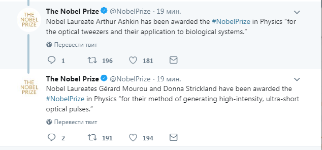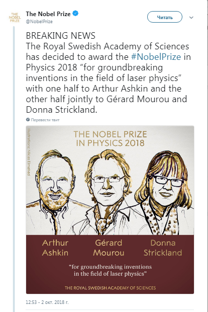 В 2018 году Нобелевскую премию в области физики получили сразу трое исследователей. Об этом сообщается в аккаунте премии в Twitter.