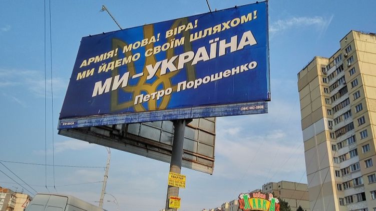 Действующий президент Петр Порошенко своему минувшему слогану "Жити по-новому" предпочел надпись "Армия. Язык. Вера. Мы идет своим путем. Мы - Украина" (см. фото выше). Эти же тезисы он активном использует в своих выступлениях, в частности, в недавнем послании к парламенту.